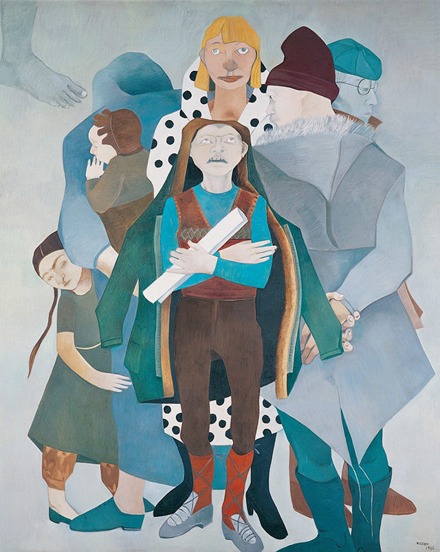 In “Paper, Mister?” we see a young boy draped in a coat that is far too big for him. It seems to offer very little in the way of protection against the crowded world within which he is struggling to exist. His own attire, which tells the viewer that he is a newcomer to city life, contrasts sharply with the clothes and lifestyles of the people around him. To his right is a woman whose face is concealed, unlike those of the other three figures. She is carrying an infant in her arm while a young daughter clings anxiously to her leg. Like the boy, they are also poor; but unlike them, there is no one the boy can depend on for help. Erdok seems to want us to understand that the boy’s entreaty is more than an attempt to just sell a newspaper: it is an existentialist cry declaring that he too is a part of the tangle of city life. This work is intimately connected with the social mobility in Turkey when it was first exhibited in 1985, at a time when a majority of the country’s population were becoming city-dwellers for the first time. The leaden tones of the ground underscore the somber winter atmosphere of the painting, while the bare lower leg and foot in the upper left-hand corner inspires feelings of detachment, nakedness, death, and fate.